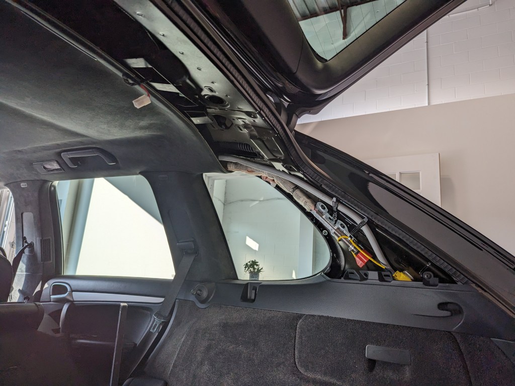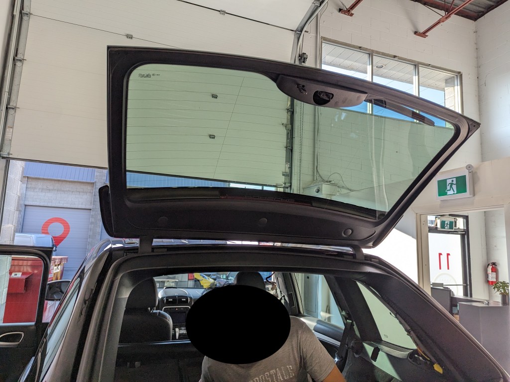 As we are in the auto glass business, interior disassembly is a regular part of our scope of work. We can assist with various automotive jobs that other mechanics and body shops may not want to touch. This Cayenne was one such job that required a complex skill set that mechanics don’t regularly encounter. With the 955/957 Cayenne generation, the rear hatch was rather over-engineered and has a total of 4 struts holding the glass up as well as the metal hatch separately.