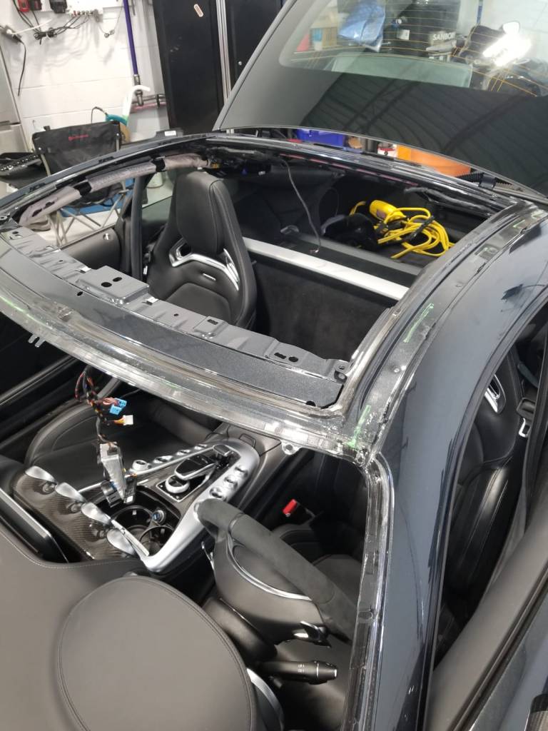 For this vehicle, the roof panel actually needs to be removed in order to take the windshield out. This includes dropping the headliner, removing the pillar trims, and removing the mirror/front windshield sensors. It should not be undertaken by any shop who has not had experience with this type of specialty vehicle as the process is significantly more work than standard windshield replacement.